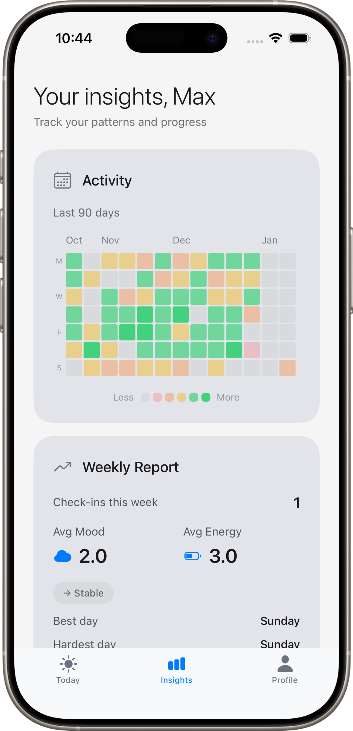 Discover patterns in your mood and energy. Get personalized insights and suggestions each week.